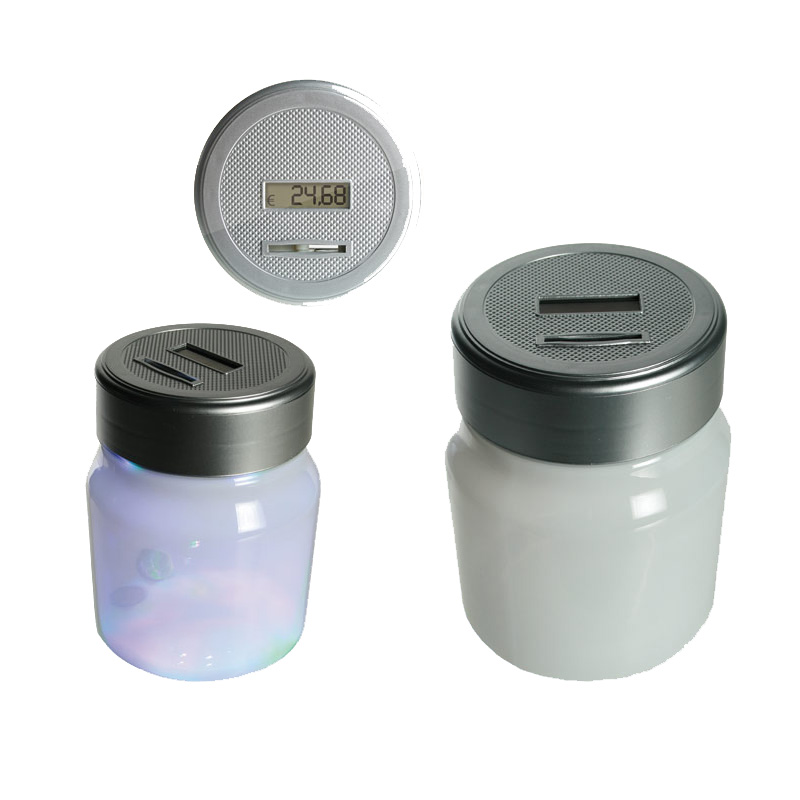 Hauska säästöpankki LED valolla varustettuna, hohtaa väreissä pimeässä, sisältää digitaalisen näytön ja ''laskurin''.:-) Pankin korkeus: 16cm, toimii 3 x AA pattereilla, ei sisälly hintaan.