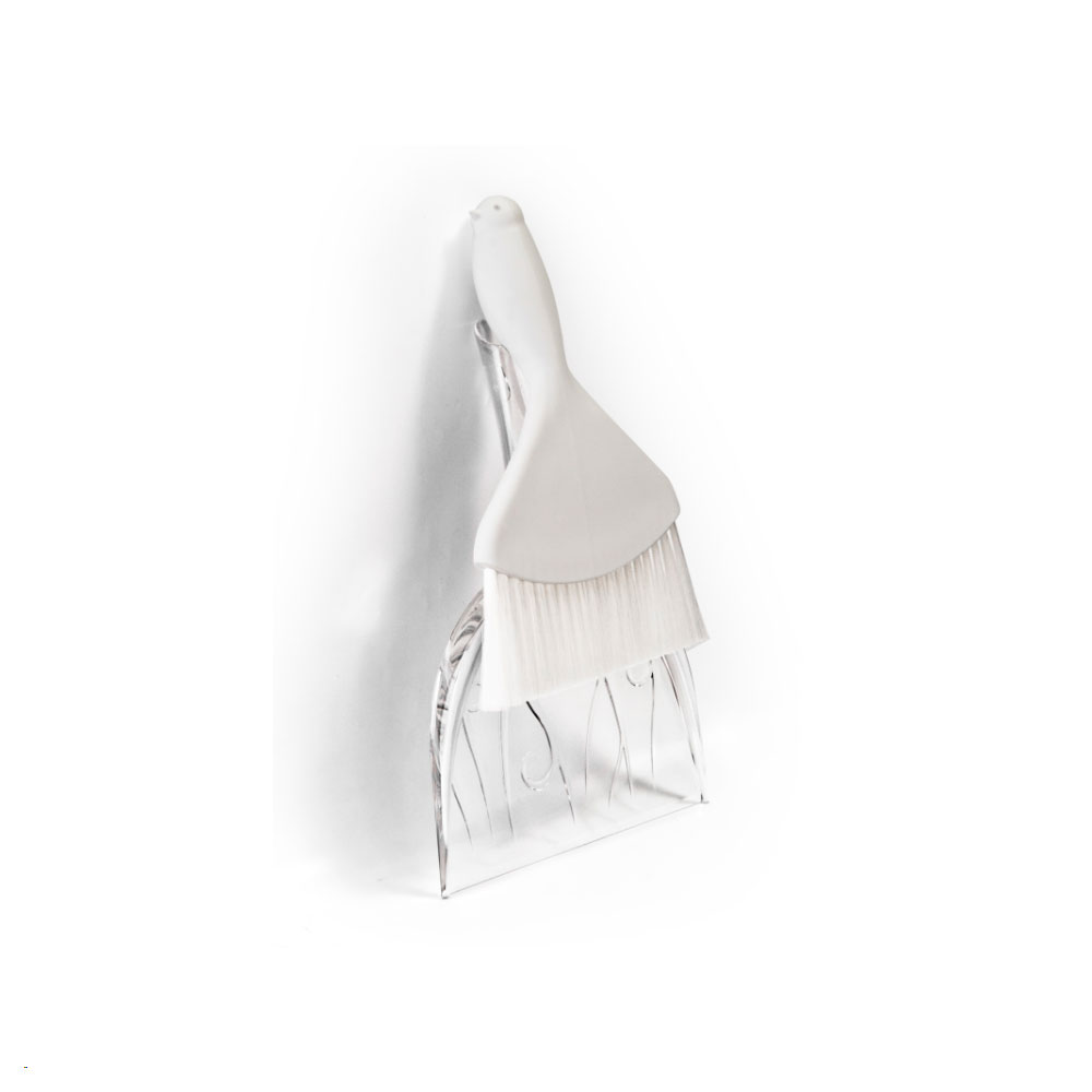 Kaunis siivoussetti. Harjan voi laittaa vaikkapa koukkuun seinälle ja lintu harja asettuu kauniisti harjan varteen kiinni.