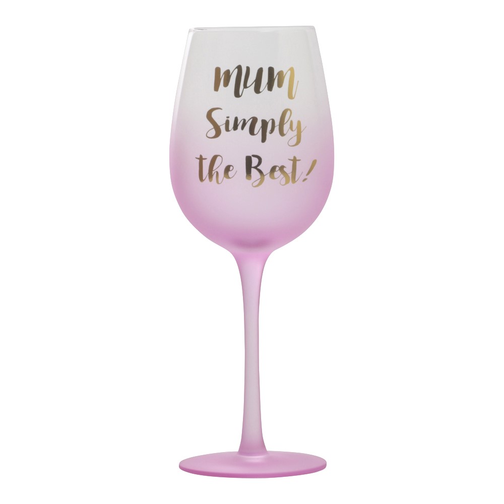Upea viinilasi äidille. Huurre pinta, hennon pinkki, kultainen teksti: Mum simply the best!, lahjapakkauksessa. Lasin korkeus n. 23cm.
