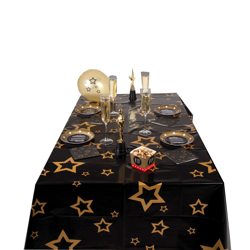 VIP sarjan muovinen pöytäliina, mustalla pohjalla kullanvärisiä tähtiä. Koko 130cm x 180cm