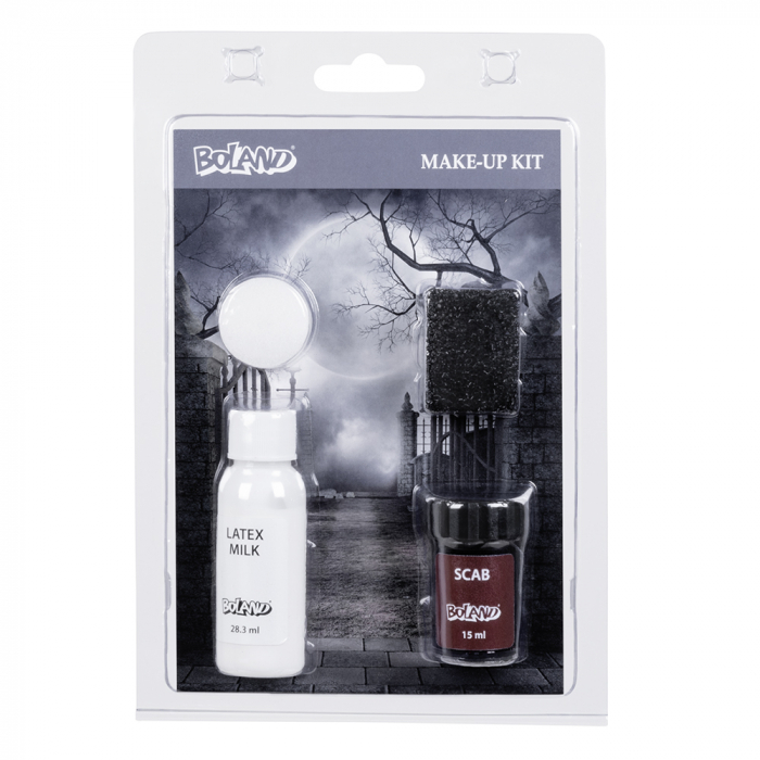 Zombie maskeeraussetti sisältää nestemäistä latexia 28ml, hyytelömäistä tekoverta, sienen ja applikaattorin